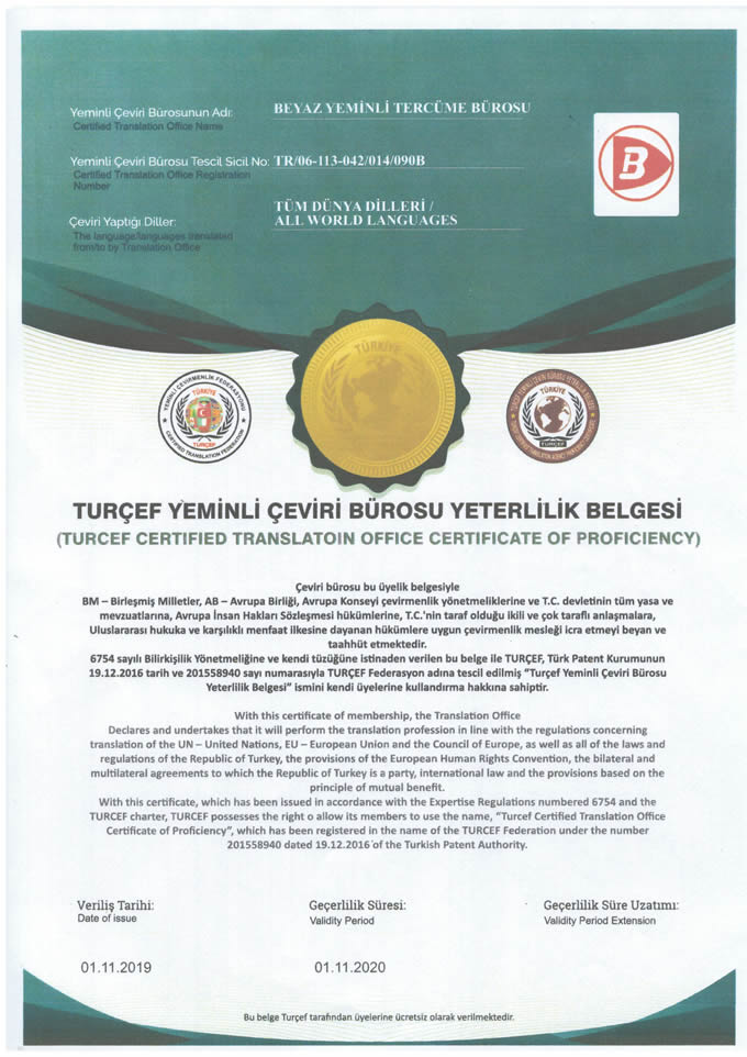 Beyaz Yeminli Tercüme Bürosu Sertifikalar